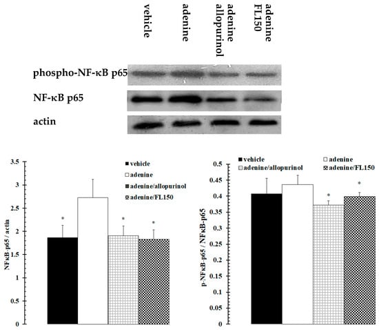 Fucoidan repressed adenine-induced expression and phosphorylation of NF-κB protein in kidney of mice. Mice were treated with vehicle, adenine, adenine plus allopurinol, and adenine plus 150 mg/kg of fucoidan for 28 consecutive days. Expression and phosphorylation of NF-κB protein was assessed using western blotting. NFκB p65, p-NFκB p65 (phospho-S536) and β-actin were observed at the sites of 64 kDa, 70 kDa and 43 kDa, respectvely. * p < 0.05 vs. adenine treated group.