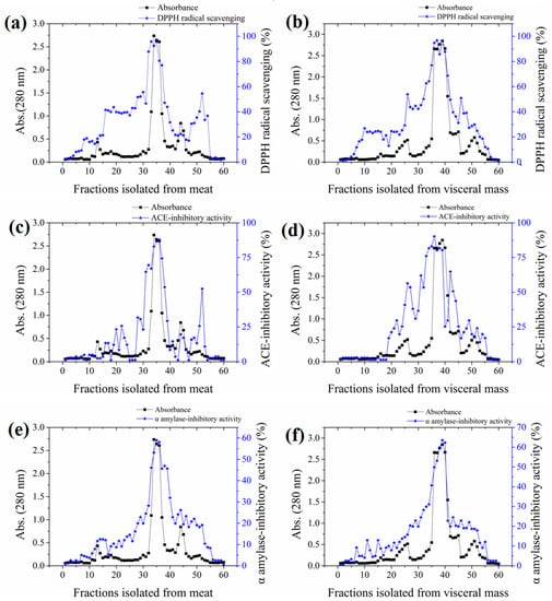 Absorbances and activities of fractions isolated from the meat and visceral mass of Neptunea arthritica cumingii (Nac) by using gel filtration column packed with Sephadex G25 gel. (a) the 2,2-diphenyl-1-(2,4,6-trinitrophenyl) hydrazyl (DPPH) radical scavenging activity, (c) angiotensin-converting enzyme (ACE)-inhibitory activity, and (e) α-amylase inhibitory activity of meat fractions; and (b) the DPPH radical scavenging activity, (d) ACE-inhibitory activity, and (f) α-amylase inhibitory activity of visceral mass fractions.
