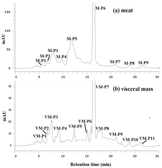 (a) Elution profiles of active fractions from the meat of Nac by hydrophilic interaction chromatography (HILIC) at 214 nm; (b) elution profiles of active fractions from the visceral mass of Nac by HILIC at 214 nm.