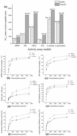 Bioactivities of two peptides. (a) half maximal inhibitory concentration (EC50) values in different models (** p < 0.01 compared with the VM-P7), (b) DPPH radical scavenging activity, (c) OH radical scavenging activity, (d) reducing power, (e) ACE-inhibitory activity, (f) α-amylase inhibitory activity, and (g) α-glucosidase inhibitory activity.
