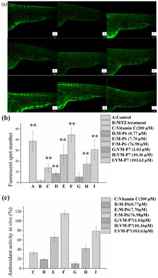 In vivo antioxidant activity of active peptides in zebrafish embryos (n = 10, mean ± standard deviation). (a) In vivo visualization of zebrafish skin fluorescence treatment with vehicle (A), metronidazole (MTZ; (B)), vitamin C (C), and low (D), medium (E), and high (F) concentrations of M-P6, as well as low (G), medium (H), and high (I) concentrations of VM-P7; (b) FS number statistic results of all groups; (c) In vivo antioxidant activity of all samples. ** indicates significant differences compared with the MTZ treatment group (p < 0.01).