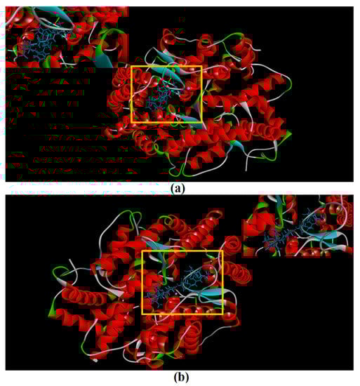 The molecular docking of YIAEDAER (a) from visceral mass and YSQLENEFDR (b) from meat to angiotensin-converting enzyme.