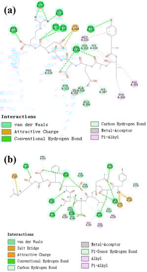 CDocker was used to further investigate the intermolecular interactions between the active peptides and ACE. Both peptides showed a stable docking structure with ACE according to the—CDocker energy and—CDocker interaction energy values (Table 3). However, YSQLENEFDR displayed better binding affinity with ACE than YIAEDAER. The docking simulation results of two peptides are shown in Figure 5 and Figure 6. Both peptides successfully entered the channel of ACE after docking (Figure 5a,b). As shown in Figure 6a,b, both active peptides combined with ACE residues through van der Waals interactions, hydrogen bonds, and electrostatic, hydrophobic, and miscellaneous interaction forces. YIAEDAER made contract with the ACE residues His 353, Ala 354, Glu384, and Tyr523 via van der Waals interactions and formed 11 hydrogen bonds with ACE residues Asn66, Asn70, Arg124, Trp220, Lys368, His387, His410, Ser516, Ser517, Pro519, and Arg522, respectively. Electrostatic force were observed between YIAEDAER and the ACE residue Lys368 interacted through an electrostatic force, whereas interactions with Met223, Tyr360, Phe391, and His410 were through the hydrophobic force. YSQLENEFDR made contact with ACE residues Glu384, Lys511, His513, Tyr520, and Tyr523 via the van der Waals force, and formed 13 hydrogen bonds with ACE residues Glu162, Asn277, Gln281, His 353, Ala354, Ala356, Tyr360, San374, Asp377, Glu403, Glu411, Pro519, and Arg522, respectively. YSQLENEFDR and ACE residues Glu162, Asp377, and Glu403 interacted with electrostatic force, whereas a hydrophobic force formed between YSQLENEFDR and ACE residues Val379, His383, and Phe527. Both YIAEDAER and YSQLENEFDR interacted with Zn (II) via miscellaneous force.