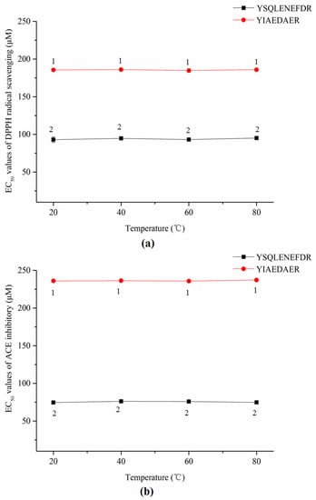As shown in Figure 7a,b, the thermal treatments did not significantly affect the DPPH radical scavenging activities or ACE inhibitory activities of both synthetic peptides according to a lack of significant change in EC50 values (p > 0.05).