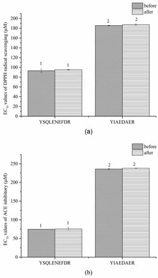 Similar results were observed in the gastrointestinal digestion treatment (Figure 8a,b). The EC50 values of DPPH radical scavenging and ACE inhibitory of both peptides slightly increased after digestion but the difference was not significant (p > 0.05). These results indicated that the two peptides, YSQLENEFDR and YIAEDAER, have thermal and gastrointestinal stability.