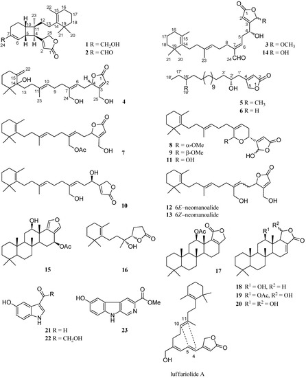 - Tsuda, M.; Shigemori, H.; Ishibashi, M.; Sasaki, T.; Kobayashi, J. Luffariolides AE, new cytotoxic sesterterpenes from the Okinawan marine sponge Luffariella sp. J. Org. Chem. 1992, 57, 3503–3507. [Google Scholar] [CrossRef]