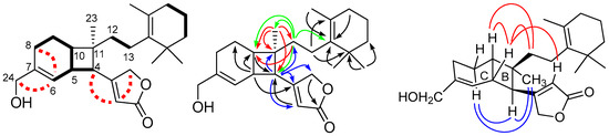 The main differences in the 1H NMR spectra of 4 and compound 13 were the absence of one olefinic methyl group resonance in compound 4 and the appearance of a resonance attributable to an exomethylene moiety (δH 4.83 and 4.91, H2-22). Observation of a sp2 methylene carbon resonance (δC 108.3) and a corresponding quaternary carbon (δC 150.5) further supported the presence of a exocyclic methylene functionality in the structure of 4. An oxygenated quaternary carbon (δC 80.4, C-14) was observed by 13C NMR and DEPT experiments. The assignment and placement of the hydroxyl substituent at C-14 and the exocyclic methylene at C-15 were deduced by observation of long range 1H–13C HMBC correlations (Figure 4 and Figure S20) (H2-13, H2-16, H2-18, H3-21/22 to C-14, H2-17 to C-15, and H2-16 to C-22). The relative stereochemistry of the methylenecyclohexane unit was elucidated mainly on the basis of NOESY correlations (Figure 4). The correlations among axial Hα-18 (δH 1.63, td, J = 13.0, 5.7 Hz), axial methylene H2-13, and equatorial CH3-20 (δH 0.96) and correlations among axial H3-21 (δH 0.88), exocyclic methylene H2-22, and equatorial Hβ-18 (δH 1.37, brd, J = 13.7 Hz) that were observed in 4 indicated that the equatorial hydroxyl group at C-14 occupied the β-face. The geometry of the olifinic bonds was assigned as 6Z,10E on the basis of NOESY correlations between H2-5 and H2-24 and between H2-9 and H3-23, respectively. Compound 4 exhibited a negative optical rotation { −20.9 (c 1.64, CHCl3)}, similar to that of 6Z-neomanoalide (13) { −28 (c 0.8, CH2Cl2)} [12] the relative stereochemistry at C-4 of 4 was then assigned to be R. Thus, the structure 4 was concluded as shown in Figure 1 and was named erectusolide D.