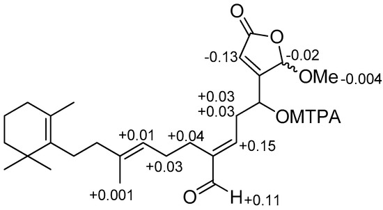 ΔδS-R values in ppm for S- and R-MTPA esters of compound 3 in CDCl3.