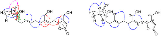 Compound 4 was obtained as an optically active ( −20.9), and its molecular formula was determined to be C25H38O5 (seven degrees of unsaturation) by HRAPCIMS. Five of the seven degrees of unsaturation implied by the molecular formula of 4 were taken up in one carbon–oxygen double bonds and four carbon–carbon double bonds, thus indicating the bicyclic nature of the molecule. The IR spectrum exhibited absorption bands corresponding to a hydroxyl group (3424 cm−1), an ester carbonyl (1739 cm−1), and an exomethylene substituent (898 cm−1). Similarities in the NMR spectra between compounds 4 (Table 2, Figures S17 and S18) and 6Z-neomanoalide (13) suggested that compound 4 was also a neomanoalide-type sesterterpene [17].
