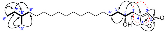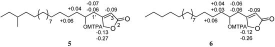 Compound 6 was obtained as optically active ( −4.9), and its molecular formula was determined to be C22H40O3 (three degrees of unsaturation) by HRESIMS. The UV, IR, 1H and 13C NMR (Figures S25 and S26) spectroscopic data of 6 indicated that it was essentially identical to compound 5. The signals of a methine moiety (C-16′; δC 34.3, δH 1.23–1.37) and a methyl group (C-19′; δC 19.2, δH 0.84) were not evident in 6, instead a methylene group (C-16′; δC 31.9, δH 1.22–1.31) was observed. The absolute stereochemistry at C-2′ of 6 was determined by the modified Mosher’s method [24]. The hydroxyl group of 6 was converted into both the S- and R-MTPA esters 6a and 6b, respectively, each of which was a single diastereoisomer judged by 1H and COSY NMR experiments. The ΔδS-R (Figure 6) values observed in the 1H NMR spectra were calculated and the resulting positive Δδ values for H2-6 (+0.04 and +0.04) and H2-7 (+0.06), and negative Δδ values for H2-1′ (−0.06 and −0.06), H-3 (−0.09), and H2-5 (−0.12 and −0.26) were consistent with the 2′R configuration. Thus, compound 6 was characterized as (R)-4-(2-hydroxyoctadecyl) furan-2(5H)-one and was named erectusfuranone B.