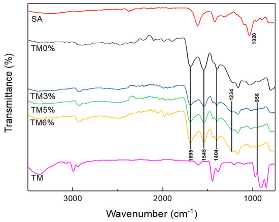 Since the structures of PASAPs can significantly affect their water absorption and dye adsorption properties, it is reasonable to characterize and tune the structures of SA-g-(PAA-co-PTM) PASAP. SA-g-(PAA-co-PTM) PASAPs were prepared with 0%, 2%, 3%, 4%, 5%, and 6% molar percentages of TM in the total monomer that were denoted as TM0%, TM2%, TM3%, TM4%, TM5%, and TM6%, respectively, and structurally characterized to explore their formation mechanism.