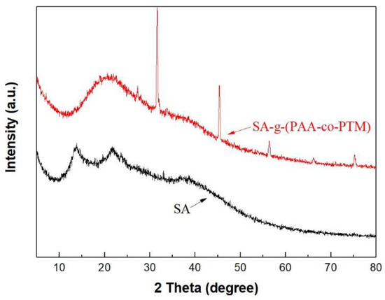 SA exhibited two dispersion peaks at 2θ = 13.73° and 21.71° (Figure 2), indicating that it was amorphous. In contrast, SA-g-(PAA-co-PTM) PASAP showed four sharp crystalline peaks at 27.30°, 31.63°, 45.37°, and 75.22°, and two microcrystalline peaks at 56.41° and 66.17°, suggesting that the graft polymerization and cross-linking produced crystalline due to the reduced molecular distance. The dispersion peak of SA-g-(PAA-co-PTM) was found between the two dispersion peaks of SA, and was obviously wider than those of SA, indicating that the intermolecular forces were increased because of the introduction of carboxyl and quaternary ammonium groups. These results further confirmed the graft polymerization between SA and the monomers.