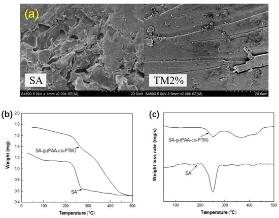 (a) SEM images, (b) TGA curves, and (c) DTG curves of SA and SA-g-(PAA-co-PTM) PASAP containing 2% TM (TM2%).