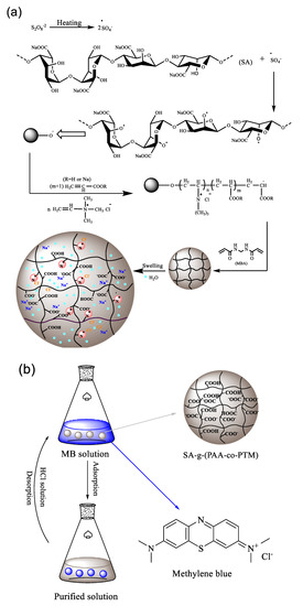 Based on these results, the formation mechanism of SA-g-(PAA-co-PTM) PASAP is proposed as shown in Figure 4a. Free radicals are generated from the decomposition of initiator and transferred onto SA to initiate the polymerization of AA and TM. Both monomers are then grafted onto the SA backbone. Polymer chains are then cross-linked to form a three-dimensional network as the cross-linker added. Figure 4b shows the proposed adsorption process of MB.