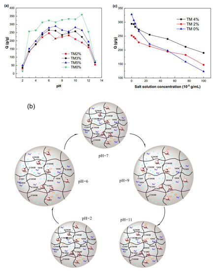 The water absorption capacities of the SA-g-(PAA-co-PTM) PASAP prepared under different conditions in the pH range of 2–13 were measured. As shown in Figure 6a, the polyanionic SAP (TM0%) exhibited only one single swelling peak under basic conditions. In contrast, all PASAPs showed two swelling peaks in the test pH range and there was no significant difference upon the peak values. The minimum swelling ratio was observed at the isoelectric point (IEP) between the two peaks, where the numbers of cationic and anionic groups were equal [20]. The unique swelling behaviors of SA-g-(PAA-co-PTM) PASAP are mainly attributed to the electrostatic interactions between the ions on the polymer chain. Figure 6b shows the pH responsive swelling mechanism of SA-g-(PAA-co-PTM) PASAP.