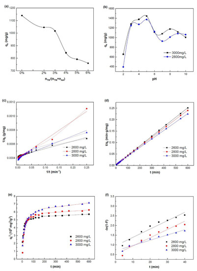 MB adsorption properties and kinetics of SA-g-(PAA-co-PTM) PASAP. (a) Effects of the amount of TM on the MB adsorption property; (b) Effects of solution pH on the MB adsorption property; (c) Pseudo-first-order model; (d) Pseudo-second-order model; (e) Weber Morris model; and (f) Boyd model. The PASAP used in (b)–(f) was TM2%.