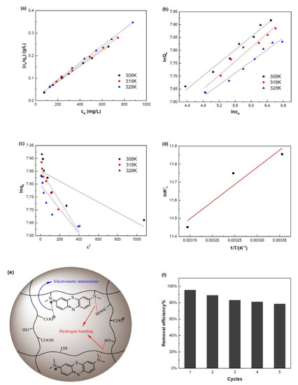 Adsorption isotherms, thermodynamics, mechanism and reusability of MB on SA-g-(PAA-co-PTM) PASAP (TM2%). (a) Langmuir model; (b) Freundlich model; (c) Dubinin-Radushkevich model; (d) thermodynamics; (e) mechanism; and (f) reusability.