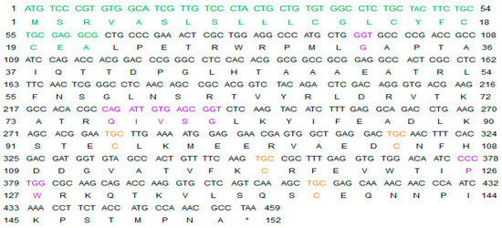 The ORF sequence of Lm-cystatin F and its deduced amino acid sequences. The upper lines show the ORF sequence of Lm-cystatin F, and the lower lines show its deduced amino acid sequence. The sequences are numbered from methionine, and terminated with stop codon. The signal peptide is shown in green; while the three conserved motifs are shown in purple, respectively. Except the cysteines in the signal peptide, the other four cysteines are indicated with orange.