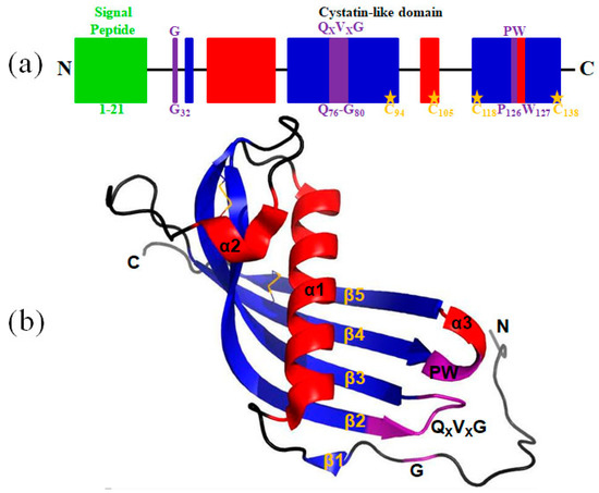 A schematic diagram of Lm-cystatin F and its predicted three-dimensional structure. (a) The diagrammatic structure of Lm-cystatin F. The signal peptide and the three conserved motifs are shown in green and purple, respectively. Except the cysteines in the signal peptide, the other four cysteines are labeled with orange. (b) The spatial structure of Lm-cystatin F was simulated with the three-dimensional structure of human cystatin F reported in the previous study [27]. The three α helixes and five β sheets are shown with red and blue, respectively. The two disulfide bonds are shown with orange.
