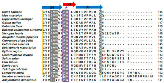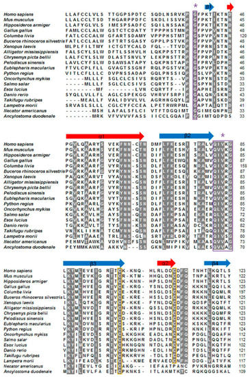 Sequence alignment of 20 cystatin F from the species mentioned previously. Except Lm-cystatin F, the sequences of 19 cystatin F were obtained from the EXPASY database and their accession numbers are listed as followed: Homo sapiens, CAD52872.1; Mus musculus, NP_034107.2; Hipposideros armiger, XP_019488972; Gallus gallus, NP_001186323; Columba livia, PKK20598.1; Buceros rhinoceros silvestris, XP_010137948.1; Xenopus laevis, NP_001091281; Alligator mississippiensis, KYO18358.1; Chrysemys picta bellii, XP_005293586; Pelodiscus sinensis, XP_006136954; Eublepharis macularius, JAC94872; Python regius, JAC94922; Oncorhynchus mykiss, XP_021420522.1; Salmo salar, NP_001134364.1; Esox lucius, NP_001297968.1; Danio rerio, NP_001082882; Takifugu rubripes, XP_011601516; Necator americanus, ETN77353.1; Ancylostoma duodenale, KIH58790.1. Additionally, the nucleotide sequence of Lm-cystatin F from L. morii was submitted to Genbank (accession number: MG902948). Dashes (-) indicate gaps inserted into the alignment. Asterisks (*) indicate the identical residues. The highly conserved motifs and cysteines are covered with purple and yellow frames, respectively.