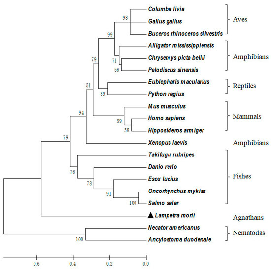 As shown in Figure 3, multiple sequence alignment showed that the three motifs of Lm-cystatin F are highly conserved. In addition to the three conserved motifs, the homology between Lm-cystatin F and cystatin F from the other species is not very high. As shown in Table 1, Lm-cystatin F shares 26–38% homology with the cystatin F from nematodas, fishes, amphibians, reptiles, aves, and mammals. Phylogenetic tree showed that the cystatin F from the 20 species is mainly clustered into two groups (Figure 4). One is from the invertebrates, while the other is mainly from the vertebrates (Figure 4). Furthermore, cystatin F in the vertebrate cluster is classified into two groups (Figure 4). One group is from fishes, amphibians, reptiles, aves, and mammals, and the other group is from agnathans (Figure 4). Phylogenetic analysis showed Lm-cystatin F was clustered as the out group of the cystatin F from fishes, amphibians, reptiles, aves, and mammals.