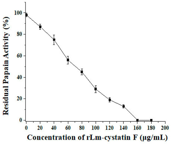rLm-cystatin F inhibited the activity of papain. Different concentrations of rLm-cystatin F (0, 20, 40, 60, 80, 100, 120, 140, 160, and 180 µg/mL, final concentration) were respectively added into the casein solution in the presence of papain. Residual papain activity was calculated based on the formula mentioned in the methods.