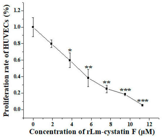 In order to detect whether rLm-cystatin F has biological functions, we firstly analyzed the inhibitory effect of rLm-cystatin F on the activity of papain with casein as a substrate. As shown in Figure 6, the degradation of casein catalyzed by papain was inhibited in a dose-dependent manner as the concentration of rLm-cystatin F increased. As the concentration of rLm-cystatin F reached 160 µg/mL, the papain activity was almost not detected. As previously reported, recombinant snake venom cystatin (sv-cystatin) from Taiwan cobra (Naja naja atra) showed anti-angiogenic activity [18,29]. Whether Lm-cystatin F is also capable of disturbing the angiogenic process has not been reported yet. In the present study, various concentrations (0, 1.9, 3.8, 5.7, 7.5, 9.4, and 11.3 μM) of rLm-cystatin F were incubated with HUVECs at 37 °C for 24 h. According to our 3-(4,5-dimethylthiazol-2-yl)-2, 5-diphenyltetrazolium bromide (MTT) assay, rLm-cystatin F showed inhibitory effects on the proliferation of HUVECs dose-dependently (Figure 7). The half inhibitory concentration (IC50) of rLm-cystatin F on HUVECs’ proliferation was 5 μM (Figure 7). Compared with the phosphate buffered saline (PBS, negative control) group, less than 10% HUEVCs were alive after treating with 11.3 μM rLm-cystatin F (Figure 7). Furthermore, 0.08 and 0.17 ng LPS, which are, respectively, equal to the content of the residual endotoxin in the 3 and 7 μM rLm-cystatin F, did not inhibit the proliferation rate of HUVECs at the same conditions (Figure S3).