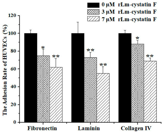 MTT assay showed that rLm-cystatin F thwarted HUVECs adhered to fibronectin, laminin, and collagen IV. PBS (0 µM rLm-cystatin F) was used as a negative control. Relative to the PBS group, * p < 0.05 and ** p < 0.01.