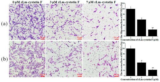 Transwell assays showed the inhibitory effects of rLm-cystatin F on the HUVEC’s migration (a) and invasion (b). PBS was used as a negative control. Relative to the PBS group, * p < 0.05 and ** p < 0.01.