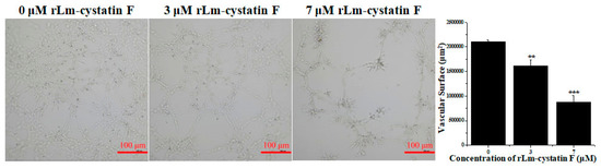 In the present study, the anti-angiogenic activity of rLm-cystatin F was analyzed in the classic tube formation assay in vitro. As shown in Figure 10, the HUVECs were able to form tube-like structures on the Matrigel obviously. However, after treating with rLm-cystatin F, the abilities of HUVECs to form the tube-like structures decreased in a dose-dependent manner (Figure 10). The inhibitory rates on the surface of the formed tubes were 23.1 ± 6% (p < 0.01) and 58.2 ± 6.23% (p < 0.001) in the 3 and 7 μM rLm-cystatin F treating groups, respectively (Figure 10). Furthermore, 0.1 and 0.2 ng LPS did not affect the tube formation of HUVECs in vitro (Figure S5). Similarly, the control protein, rLj-26, which was also expressed in E. coli and contained a His-tag as well as the residual LPS, did not inhibit the tube formation of HUVECs in vitro (Figure S6).