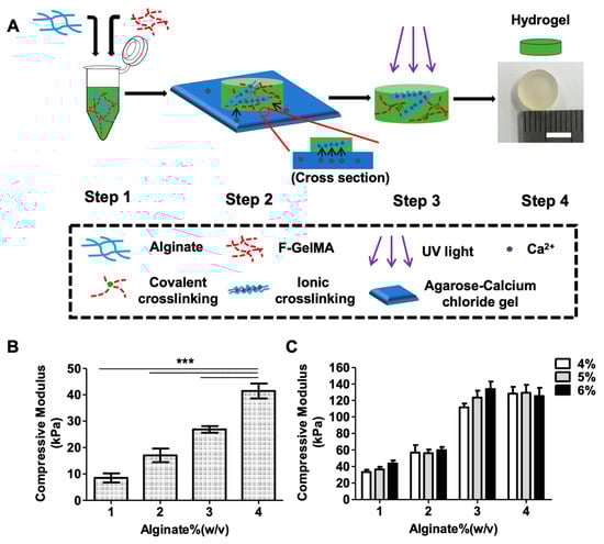 Schematic illustration of fabrication of alginate/f-GelMA hydrogel and mechanical properties. (A) Schematic diagram showing the process of fabrication for alginate/f-GelMA hydrogel. Step 1: Hydrogel solution containing alginate, f-GelMA, and 0.5% photoinitiator. Step 2: Polymerization of alginate in the presence of calcium ions (Ca2+) diffused from agarose-calcium chloride gel. Step 3: Polymerization of f-GelMA in the presence of photoinitiator under UV illumination. Step 4: photograph of alginate/f-GelMA hydrogel with 8 mm diameter and 2 mm thickness (Scale bar = 5 mm). The composition of alginate/f-GelMA hydrogel was 1%, 2%, 3%, and 4% alginate mixed with 4%, 5%, and 6% f-GelMA, respectively. (B) Compressive modulus of different concentrations of pure alginate (n = 3 per group and *** p < 0.001 was considered statistically significant). (C) Compressive modulus of alginate/f-GelMA hydrogels with different compositions.