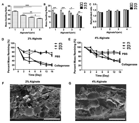 Physical characteristics (swelling ratio, degradation property, and morphology obtained with SEM) of alginate/f-GelMA hydrogels. (A) Mass swelling ratios of pure alginate hydrogels at 1%, 2%, 3%, and 4%. (B) Mass swelling ratios of alginate/f-GelMA hydrogels consisting of 1%, 2%, 3%, and 4% and 4%, 5%, and 6% f-GelMA. (C) Rehydrated ratios of alginate/f-GelMA hydrogels consisting of 1%, 2%, 3%, and 4% and 4%, 5%, and 6% f-GelMA. (* p < 0.05, ** p < 0.01, *** p < 0.001 was considered statistically significant and n = 5 per group). (D) Degradation property of alginate/f-GelMA hydrogel with 2% alginate and 4%, 5%, and 6% f-GelMA. (E) Degradation property of alginate/f-GelMA hydrogel with 4% alginate and 4%, 5%, and 6% f-GelMA (n = 3 per group). (F) A micrograph obtained using SEM shows a random region of alginate/f-GelMA hydrogel (2% alginate and 6% f-GelMA). (G) A SEM micrograph showing a random region of alginate/f-GelMA hydrogel (4% alginate and 6% f-GelMA) (Scale bar = 1 mm).