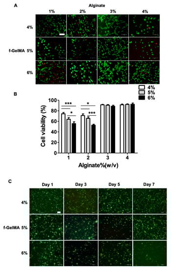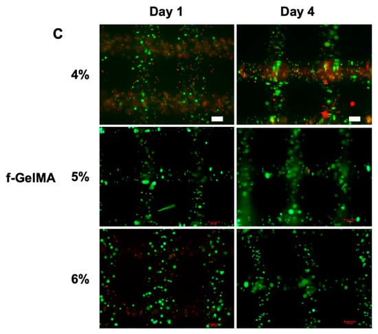 To assess the cell behavior and examine the feasibility (cell viability, adhesion, and cell proliferation) of alginate/f-GelMA hydrogel, cell adhesion and 3D cell encapsulation assays were performed to examine the ability to bind to alginate/f-GelMA scaffold which is crucial for cell survival. NIH-3T3 fibroblasts were employed in this study and Live/Dead assay was performed to evaluate cellular viability and visualize cell behavior. NIH-3T3 cells adhered to the surface of alginate/f-GelMA hydrogel with good cell morphology at the concentration of 1%, 2%, and 3% alginate after 24 h of culture (Figure 3A). However, at 4% alginate, the cells still maintained its round shape at 4% and 5% f-GelMA and showed the same cell adhesion as 1%, 2%, and 3% alginate at 6% f-GelMA (Figure 3A). In terms of cell viability, the cell survival ratio decreased with the increasing concentration of f-GelMA at 1% and 2% alginate. At 3% and 4% alginate, no difference was observed between various f-GelMA and high cell viability, over 90%, was observed (Figure 3B). These results illustrated that different ratios of alginate/f-GelMA influenced cell behavior. To further examine the feasibility of alginate/f-GelMA hydrogel for tissue engineering application, 3D cell encapsulation assay was carried out in alginate/f-GelMA hydrogel using NIH-3T3 cells. With high cell viability in cell adhesion assay and mechanical modulus, hydrogels with 4% alginate were chosen for the test as this formulation performed best in the 3D bioprinting process. Encapsulated NIH-3T3 cells were cultured for seven days and cell viability was determined using LIVE/DEAD assay kits. As shown in Figure 3C, cells maintained high viability during the culture period (one, three, five, and seven days) and demonstrated that cells can maintain long-term survival rates in alginate/f-GelMA hydrogel. Because hydrogel stiffness affects cellular morphologies, the higher stiffness in 4% alginate hydrogel may be the potential factor affecting cell elongation in alginate/f-GelMA hydrogels [].