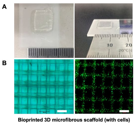Our previous work showed that f-GelMA can be a promising engineered biomaterial in the tissue engineering and biomedical fields. In this study, to improve the properties of f-GelMA, we first developed an interpenetrating polymer network containing two marine-derived materials, alginate and fish gelatin, to extend the usage of f-GelMA. When examining the physical properties of alginate/f-GelMA, the hydrogels displayed many advantages such as mechanical strength, degradation, long-term survival, and high cell viability. These results showed that alginate and f-GelMA may serve as valuable biomaterials for biomedical applications. One of the most valuable applications of biomaterials is in 3D bioprinting. To examine the feasibility of alginate and f-GelMA polymers for the application of 3D bioprinting, 4% alginate with the highest mechanical strength was selected and subject to testing (with 4%, 5%, and 6% f-GelMA). The cell-laden hydrogel was deposited and the final dimension of the printed product was a 10-layered scaffold which was 10 mm in length and 10 mm in width (Figure 4A). In addition, to further confirm the morphology and the cell viability in the process of printing, a two-layer scaffold was printed and Live/Dead assay was carried out to investigate the cell survival ratio. As shown in Figure 4B, the printer scaffold displayed a satisfactory 3D arrangement under microscopy (left) with high cell viability (right). For the long-term cell survival test (Figure 4C), the composition of 4% alginate and 4% f-GelMA showed lower cell viability than the other two groups and after four days of culture, 4% alginate composed with 5% or 6% f-GelMA maintained a high cell survival ratio.