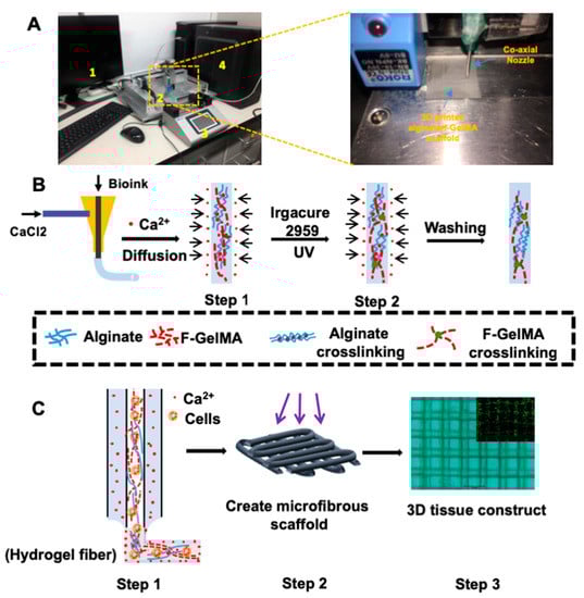 Inspired by applications of f-GelMA in tissue engineering, the current study applied f-gelatin to custom-built bioprinting systems (Figure 5A) by employing bioink, as shown in Figure 5B,C. In order to print f-GelMA, alginate was used to improve the printing ability of f-GelMA as alginate possesses a fast gelation process via ionic crosslinking. In addition, alginate improves the physical properties of f-GelMA hydrogel via IPNs which resulted in the creation of a robust printed construct without any collapse. The 3D bioprinting system that was built consists of four parts (Figure 5A): (1) the computer, (2) the bioprinter (Isolunix, Seoul, Korea) (3) the microfluidic syringe pump, and (4) the connector. In this printing system, commercial needles of different sizes, ranging from 18G to 27G, were used to fabricate the co-coaxial nozzle system for the bioprinting process shown in Figure 5A (left) and Step 1 of the diagram in Figure 5B. Briefly, the 3D printing began as the bioink and calcium chloride solution met at the top of the co-axial nozzle. During the printing process, alginate first undergoes gelation in the presence of calcium ions (Ca2+), as shown in Figure 5B,C Step 1, and continued until the microfibrous scaffold was finally printed. Then, the printed scaffolds were exposed under UV light for the desired time until f-GelMA was photocrosslinked to achieve gelation, as shown in Figure 5B,C Step 2. After the washing step, the scaffolds (Figure 5C Step 3) could be employed for further experiments. Meanwhile, to obtain the desired, continuous diameter of printed fiber, the different deposition speeds of the coaxial needle were tested, ranging from 4 to 6 mm/sec, as well as the speed of two flows, ranging from 5 to 10 µL/min. In the final condition, the deposition speed of the coaxial needle at 4 mm/sec and the speed of the two flows at 5 µL/min were employed throughout this study. As shown in Figure 5C, the optimized microfibrous 3D scaffold showed good cell morphology along with high viability (containing 4% alginate and 6% f-GelMA) and verified that f-GelMA could be a promising bioink candidate for 3D bioprinting applications.