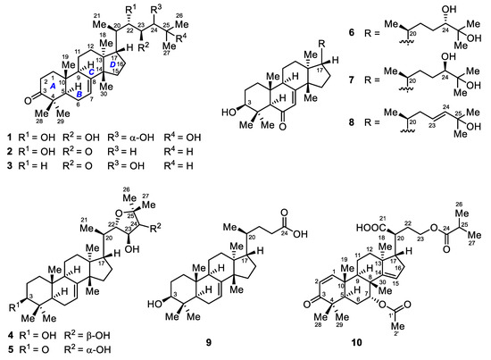 Compound 10 provided the molecular formula C32H46O7 based on the positive HR-ESIMS quasi molecular ion peak at m/z 543.3303 ([M + H]+, calculated for 543.3316) (Supplementary Material S251), requiring ten degrees of unsaturation. According to the 1H and 13C NMR spectroscopic data of 10 (Table 3 and Table 4) (Supplementary Materials S252‒S258), six of the 10 elements of unsaturation were due to two carbon-carbon double bonds and four carbonyls. Thus, the molecule was tetracyclic. The DEPT135 experiment of 10 (Supplementary Materials S259‒S261) combined with its 13C NMR spectroscopic data revealed the presence of eight methyl groups, six methylene groups, nine methine groups (including three olefinic ones), and nine quaternary carbons (including four carbonyl carbons).