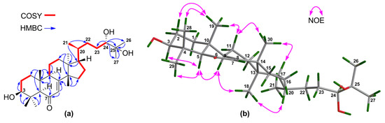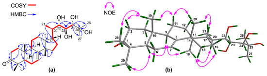 The molecular formula of 6 was concluded to be C30H50O4 by the positive HR-ESIMS quasi molecular ion peak at m/z 475.3790 ([M + H]+, calculated for 475.3782) (Supplementary Materials S138 and S139). The 1H and 13C NMR spectroscopic data of 6 (Table 3 and Table 4) (Supplementary Materials S140‒S146) resembled those of brumollisol B [26], except for the absence of the 23-OH group, being corroborated by the upshifted C-23 (δC 69.5 CH in brumollisol B; whereas δC 28.4 CH2 in 6), 1H‒1H COSY correlations (Supplementary Materials S149‒S152) between H2-23/H-24, and HMBC correlations (Supplementary Materials S157‒S164) from H3-26 and H3-27 to C-24 (Figure 8a).