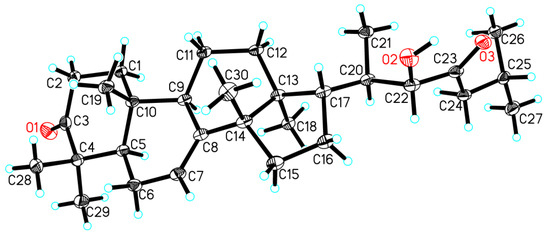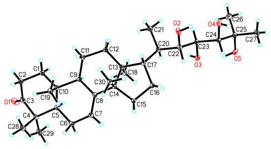 NOE interactions (Supplementary Materials S53‒S58) between H-5/H-9, H-5/H3-29, H-9/H3-18, and H3-18/H-20 assigned the α-oriented H-5, H-9, H3-18, and H3-29; whereas those between H3-19/H-2β, H3-19/H3-28, H3-30/H-12β, H3-30/H-17 concluded the β-oriented H-17, H3-19, H3-28, and H3-30. Finally, single-crystal X-ray diffraction analysis, conducted with Cu Kα radiation (Flack parameter of 0.08(13)) (Figure 4), unambiguously established the absolute configuration of the whole molecule of 2. Therefore, the absolute configuration of 2, named xylocarpol B, was unambiguously determined to be (5R,9R,10R,13S,14S,17S,20R,22S)-22-hydroxytirucalla-7-ene-3,23-dione.