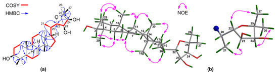 1H‒1H COSY correlations (Supplementary Materials S16‒S18) between H-22/H-23 and H-23/H-24 and HMBC correlations from H-24 to C-25, C-26, and C-27 confirmed the connection of the fragment of C-22(OH)–C-23(OH)–C-24(OH)–C-25(OH)–(Me)2 (Figure 2a). The NMR spectroscopic data of 1 resembled those of toonaciliatavarin E [22], except for different orientations of three chiral centers on the C-17 side-chain, videlicet C-22, C-23, and C-24.