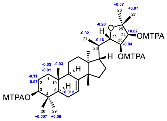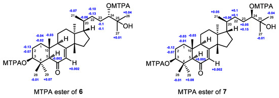 The absolute configuration of 6 was established by the application of the modified Mosher’s MTPA ester method [25]. The (3,24)-di(S)- and (3,24)-di(R)-MTPA esters of 6 were prepared (Supplementary Materials S290‒S297). Based on the MTPA ester rule of Δδ (δS − δR) values (Figure 9) [25], the absolute configurations of C-3 and C-24 were assigned as S and S, respectively. Hence, the absolute configuration of 6, named agallochol A, was unequivocally assigned as (3S,5R,9R,10R,13S,14S,17S,20S,24S)- 3,24,25-trihydroxytirucalla-7-ene-6-one.