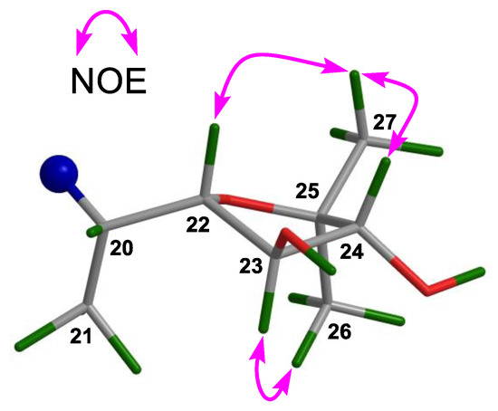 Diagnostic NOE interactions for the 2,2-dimethyltetrahydrofuran-3,4-diol moiety of 5.