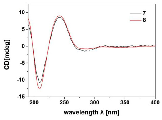 Comparison of the experimental ECD spectra of 7 and 8 (measured at concentrations of 100 and 167 µg/mL in acetonitrile, respectively).