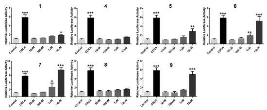Agonistic effects of 1, 4–9 on the farnesoid–X–receptor (FXR) in HepG2 cells. CDCA (80.0 µM) was used as the positive control. * p < 0.01, ** p < 0.001, *** p < 0.0001 compared to the control group.