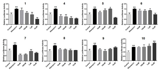 Agonistic effects of 1, 4–10 on the pregnane–X–receptor (PXR) to modulate PXR target gene CYP3A4 transactivation in HepG2 cells. Rifampicin (10.0 µM) was used as the positive control. * p < 0.01, ** p < 0.001, *** p < 0.0001 compared to the control group.