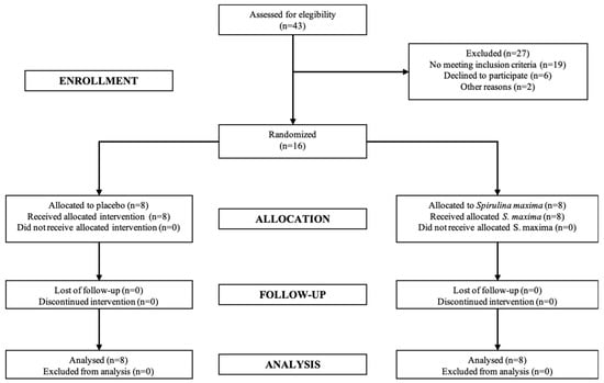 A total of 16 patients were included in the present study. The CONSORT (Consolidated Standards for Reporting Trials) diagram is shown in Figure 1. The patients fully complied with the clinical protocol procedures. Patient demographic data treated with SM or placebo did not show statistical differences (p > 0.05) (Table 1). There was no significant difference between the SM and placebo groups in outcome variables at baseline.