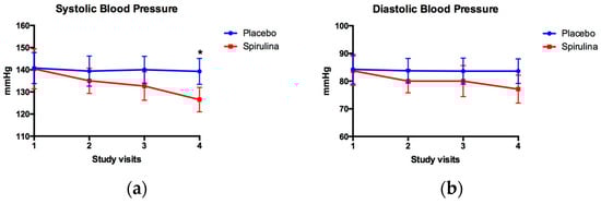 Figure 2 shows the behavior of the systolic and diastolic blood pressure during 4 visits (12 weeks) in the groups treated with SM or placebo; in the case of systolic blood pressure, changes that were statistically significant were observed only in visit 4 (140.00 ± 6.05 vs. 126.50 ± 5.53 mm Hg, for placebo and Spirulina groups, respectively). Regarding the diastolic blood pressure, no statistically significant changes were observed throughout the treatment.