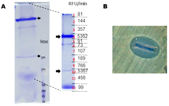 To detect the amino acid oxidase activity, a fluorimetric assay for the determination of the H2O2 production was routinely used (Amplex Red hydrogen peroxide/peroxide assay; Invitrogen) []. The assay mixture (100 μL) contained the substrate (at the specified concentration) in a 50 mM sodium phosphate buffer with NaCl 0.5 M pH 7.4, 0.05 mM Amplex Red, 0.1 U/mL of peroxidase, and 10 μL of sample. Reactions were carried out at 37 °C for 15 min in 96-well microplates. Amplex Red oxidation was followed using an excitation filter of 550 nm and an emission filter of 590 nm in a FLUOstar Optima (BMG LabTech, Ortenborg, Germany). The activities were normalized according to the milligrams of protein present in each sample, and were measured by the Bradford assay (Sigma, St. Louis, MO, USA). The fluorometric assay was also used to determine directly the amino acid oxidase activity in the fragments sliced from SDS-PAGE, which were previously fixed and washed with deionized water, as previously described [].