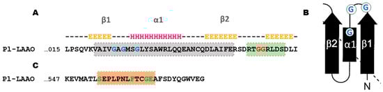 The Pl-LAAO sequence presents a similarity from positions 28–440 to the pfam01593 domain, which is characteristic of amino oxidases. The sequence analysis also showed in Pl-LAAO some conserved motifs of the FAD/NAD(P)-binding domain superfamily []. For instance, the conserved dinucleotide binding motif (DBM), with the consensus sequence xhxhGxGxxGxxxhxxh(x)8hxhE(D) (where x is any residue and h is a hydrophobic residue) is located in the N-terminus (Figure 3A). In addition, when analyzing the prediction of the secondary structure of this N-terminal region with JPred4 (http://www.compbio.dundee.ac.uk/jpred/), a structure β1α1β2 is clearly observed, in which the arrangement of the glycines coincides with the characteristic glycine-rich phosphate-binding loop of the Rossmann fold [] (Figure 3B). Shortly after the DBM domain in the Pl-LAAO sequence, it is possible to recognize the “GG motif” (RxGGRxxS/T), which is a common feature in LAAOs sequences []. Another conserved FAD-binding sequence motif is an eleven amino acid segment, T(S)xxxxxF(Y)xxGD(E), which has been described in the C-terminal region of proteins from the glutathione reductase family []. The only difference is that this motif in the Pl-LAAO sequence shows an additional residue between S and F (Figure 3C).
