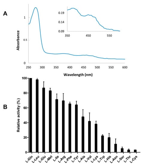 (A) UV-VIS spectrum of purified recombinant Pl-LAAO enzyme solution. (B) LAAO activity spectrum of Pl-LAAO. Values are expressed as percentage of the activity on the best substrate. The 20-protein standard amino acids were assayed at 2 mM, but only the oxidized ones are shown.