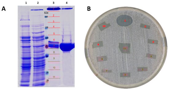 Next, P. luteoviolacea CPMOR-2 was cultivated until stationary phase in MNGY, and the supernatant was collected and concentrated using centrifugal filters of a 30 kDa cut-off. These samples were run under SDS-PAGE in non-denaturing conditions for LAAO activity (see material and methods), and slices were cut from the gel and evaluated for LAAO and antimicrobial activities. Two protein bands (fragments 4 and 10) were detected with LAAO activity (Figure 2A). In addition, from a set of parallel identical lines, those two bands with LAAO activity were excised, and the trypsin was digested, subjected to HPLC-MS/MS and analyzed against P. luteoviolacea CPMOR-2 genome. It was observed that various peptides from the upper band matched the protein with GenBank accession number KZN49687 (with a coverage of 22%). This protein has been named in this work as Pl-LAAO. The second band with low molecular mass corresponded to PlGoxA (accession WP_063358237) (coverage of 16%), a LAAO with quinone cofactor specific for glycine, which was recently described []. The upper band showed a strong antimicrobial activity (Figure 2B). Accordingly, we hypothesized that the upper band may correspond to the LAAO with a broad substrate range previously reported in P. luteoviolacea CPMOR-2 [].